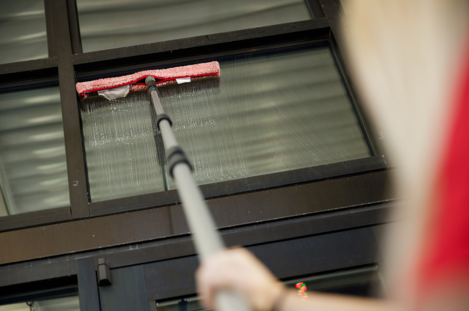 water-fed cleaning poles and purified water to clean higher up on windows, leaving a streak-free shine without soap. Other companies may use nontoxic or biodegradable cleaning products.